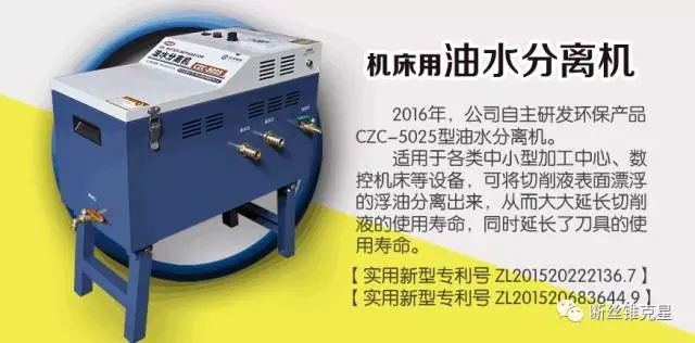 2016年,公司自主研發(fā)環(huán)保產(chǎn)品CZC-5025型油水分離機(jī)。適用于各類中小型加工中心、數(shù)控機(jī)床等設(shè)備,可將切削液表面漂浮的浮油分離出來,從而大大延長切削液的使用壽命,同時(shí)延長了刀具的使用壽命。
